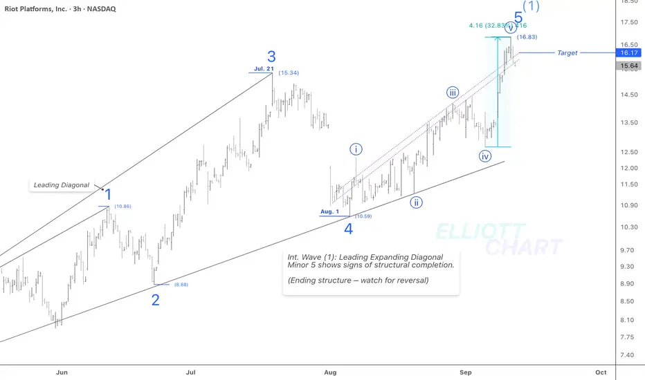 RIOT has surged 33% this week, slightly surpassing the projected key target at 16.17—potentially signaling a peak or the completion of the final wave within the current structure.