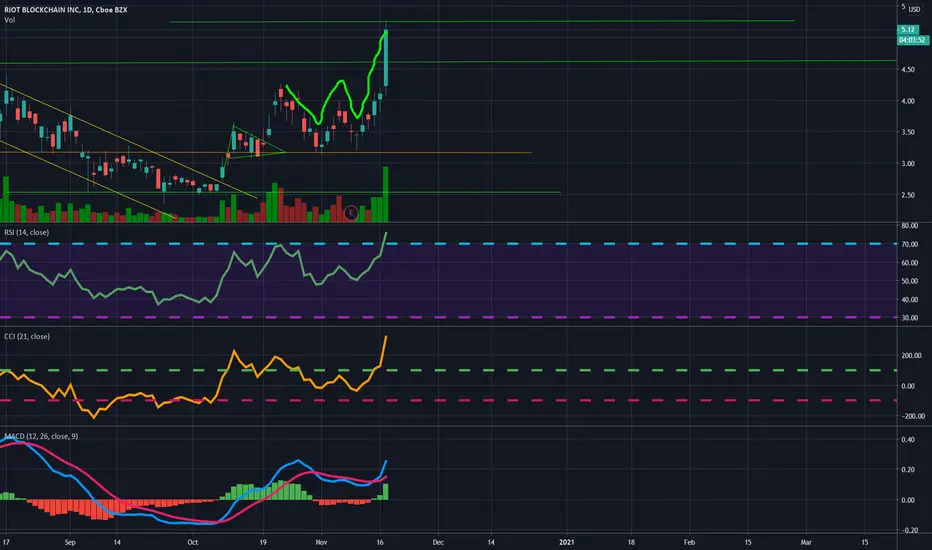 Double bottom on the daily chart and we seem to be breaking out. Long bullish on RIOT.