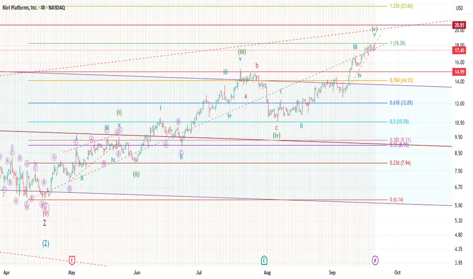 RIOT has successfully managed to complete a 5 waves bullish sequence with somewhat of an ending diagonal finish as of Friday close. The closing hour was a pretty sharp drop with somewhat of a bear flag pattern after closing. This may suggest that the top is in for the sequence. If you have booked a profit, congratulations to you! I am now very curious about how the next move will play out. It is always possible that the upside move is not yet complete. It will not be confirmed until price breaks below $16.8. But the preliminary signs are suggesting that distribution has begun. If it is indeed a time for correction, then the support points are lining up with Fib retracement areas almost perfectly. BTC is the key to everything else here. BTC is also looking to put in a B wave top for a larger wave 4, that may take the price down to around 100k. Trad markets, even though put in higher highs last week are poised to make a turn as well. The next 2 weeks will be very important for the rest of the year.