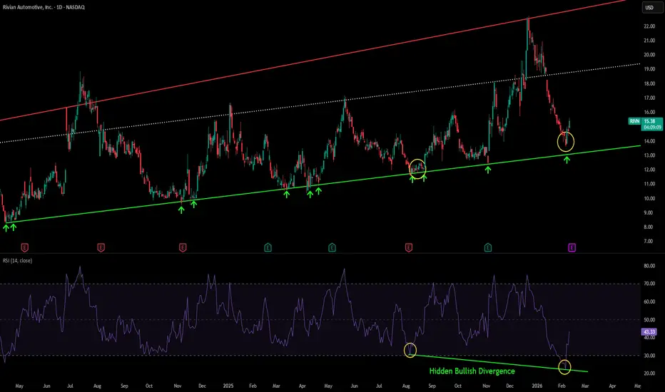RIVN has just confirmed yet another higher low! This has also helped it formed a hidden bullish divergence. Price put in a higher low while the RSI put in a lower low (yellow circles). This should signal the existing uptrend will continue.