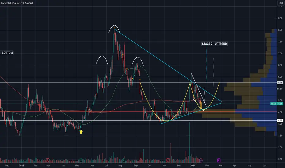 On the longer-term timeframe, the stock is trading inside a triangle with the cup and handle pattern, with a projected measured move of $7.50.