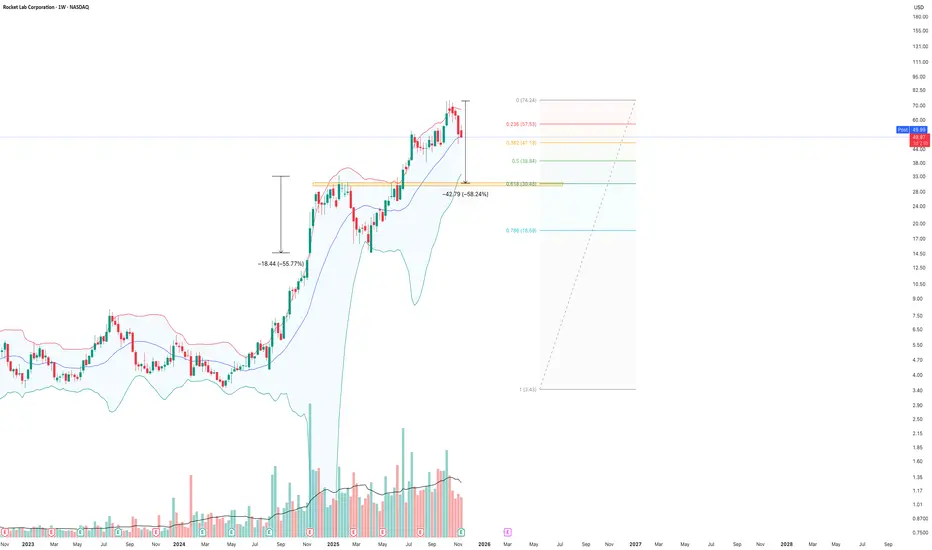 RKLB is completing a healthy corrective phase that mirrors its last major pullback. The current drop of ~58% is nearly identical to the previous ~56% correction, showing consistent trend behavior. Price is now heading toward the bottom of the weekly Bollinger Band, which aligns perfectly with the 0.618 Fibonacci retracement (~$31–33)—a historically reliable reaccumulation zone in RKLB’s uptrend.