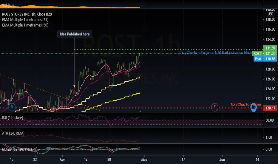 ROST just hit its first target. EMA 50 hourly still working really nice as support for the fast uptrend.