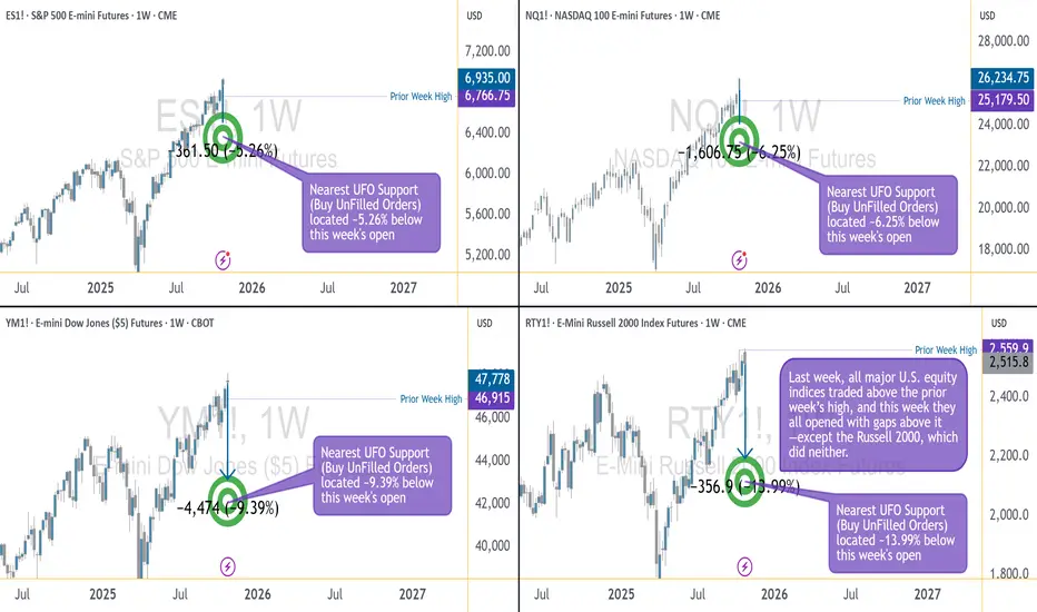 Under the surface, liquidity pockets (UFO supports) show the “landing zones” below price: