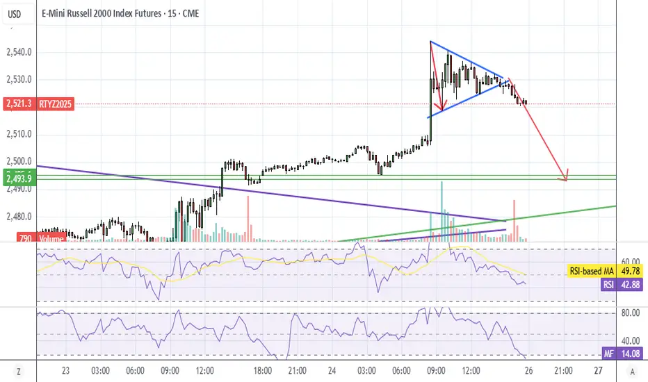 RTY has a small open gap from the Thurs 1 hr break that does not exist on NQ and ES. Pennant breakdown also looks bearish.
