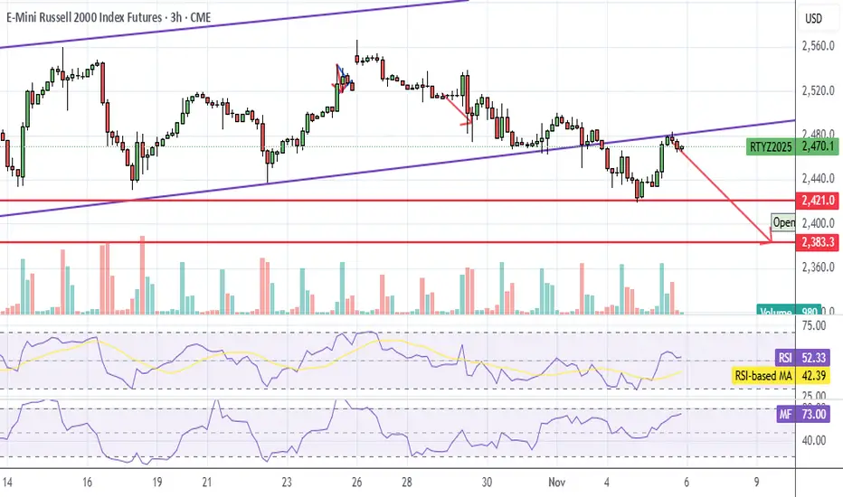 MFI should hit overbought tomorrow, RTY might be the only index that fills the TACO gap. It tried to regain the upward channel and failed today.