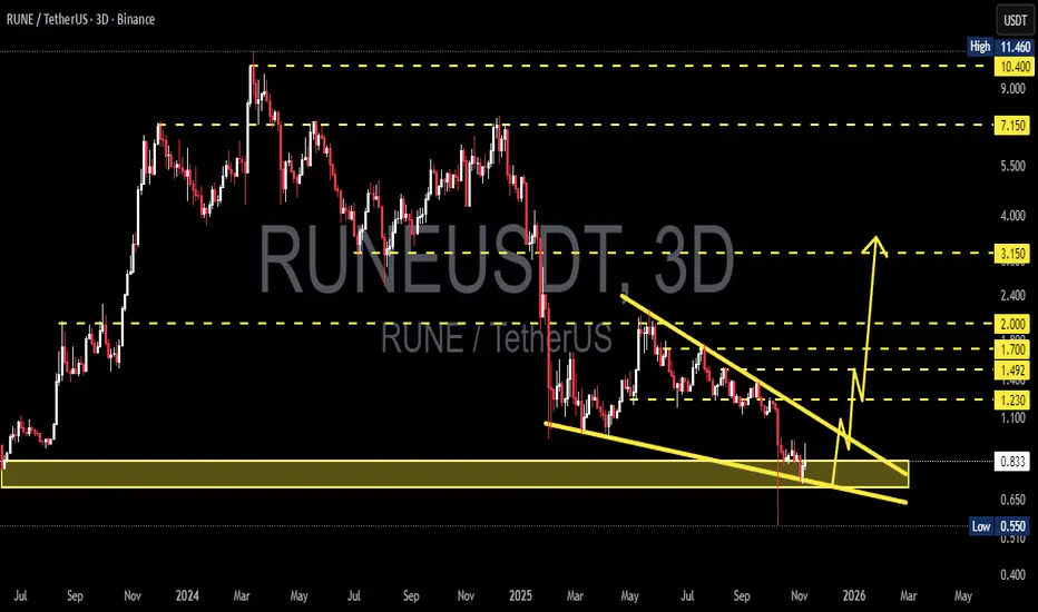 After a prolonged downtrend from the peak around $11.46, RUNE/USDT has now returned to the golden zone ($0.70–$0.833) — a major historical support area that once served as the launchpad for a massive rally.