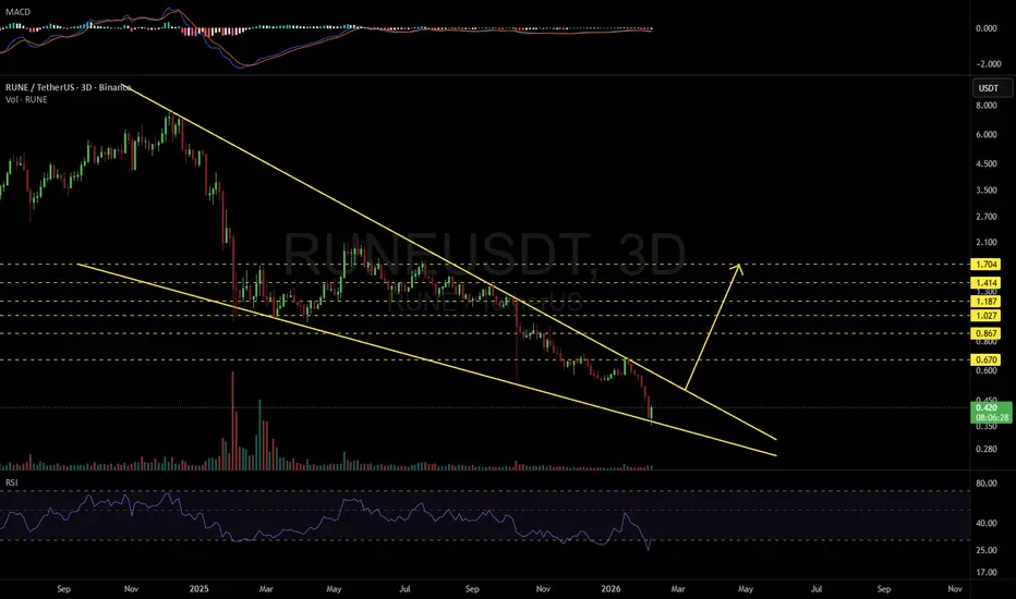 #RUNE is trading within a falling wedge pattern on the 3-day chart. It has bounced from the wedge support and is now moving toward the wedge resistance. If a breakout above this level occurs, the potential upside targets are: