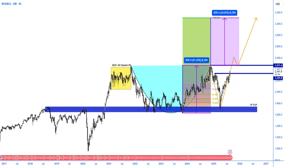 Russell has created a generational sized bullish cup and handel pattern, with the crypto alt season heating up along side, i have highlighted the 2021 alt coin season to show that alts moed hundreds of percent where Russell made a strong impulsive move upwards but then consoldated, i believe this will be dwarfed on the alt coin charts with a huge breakout on Russell pending.