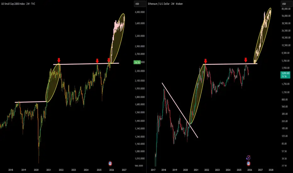 I am comparing US Small Caps (Russell 2000) on the left with Ethereum (ETH) on the right.