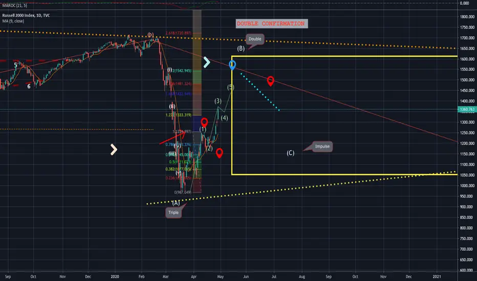 RUT wave (B) rally on-going moving towards the underside of a 4 decade support-turned resistance at 1432-1542. If this is the case, bulls need to get a move on to keep the motive-looking effort going. Will the coming bear market continue this trend and see bear markets in both as US debt is shunned by global central banks as a store of value?