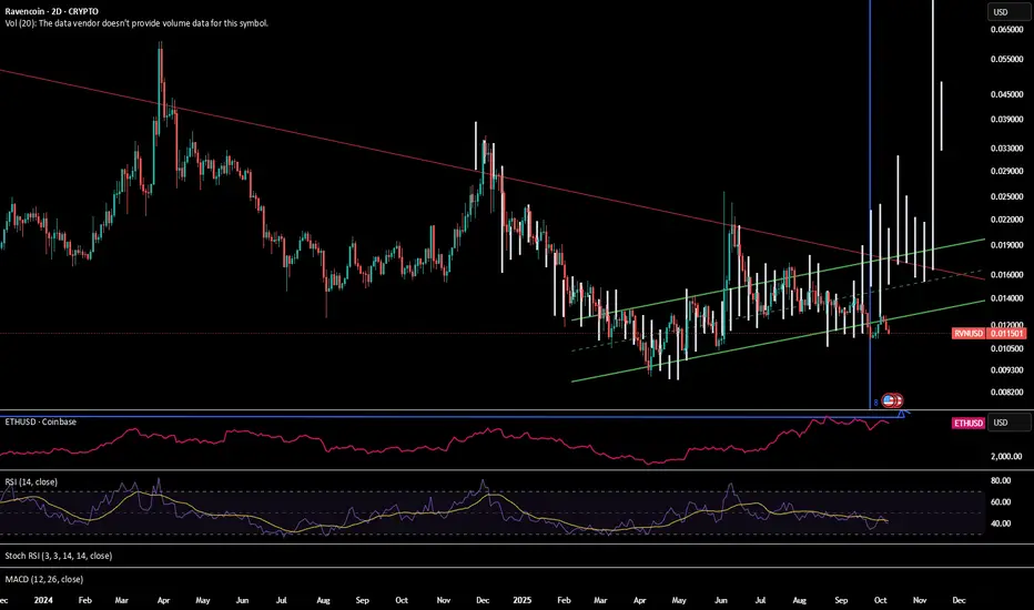 Ravencoin (RVN) continues to move inside the same structural rhythm we’ve seen before. The wedge timing, price compression, and sentiment all echo early-2021 conditions — and despite recent hesitation, the fractal remains intact.