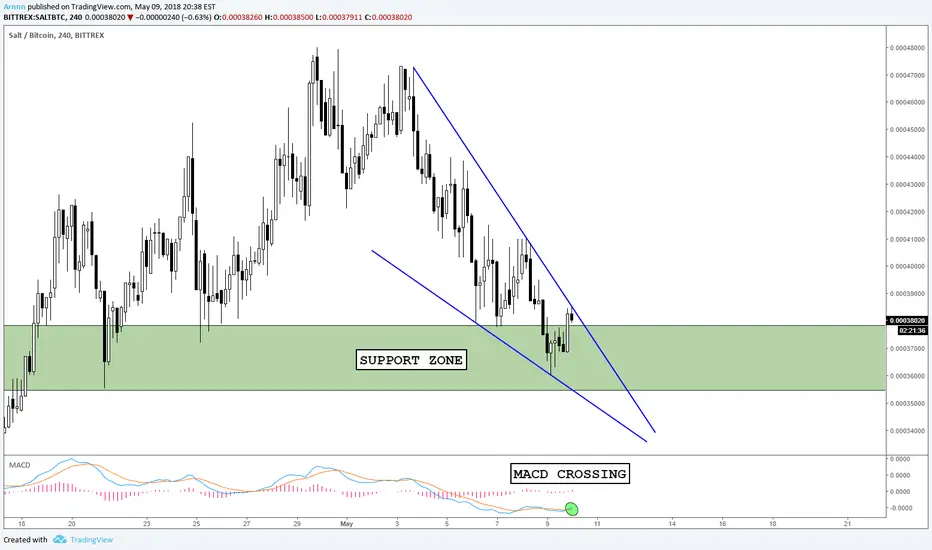 SALT here. Falling wedge, MACD looking bullish and looks like it's going to breakout very soon.