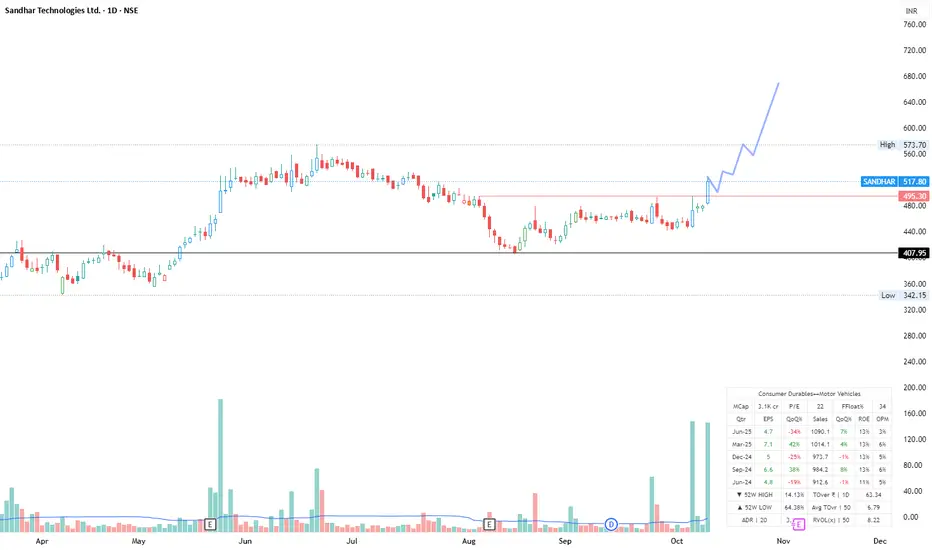 Sandhar Tech an Auto Spare part company gave a breakout with good volume potentially ready for another rally . May consolidate for few days and then it can give another breakout. SL will be 440 with an potential upside of of 680