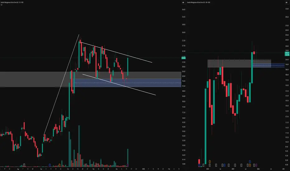 On the right, the monthly timeframe of the same instrument is added to provide broader structural context to the daily pattern.