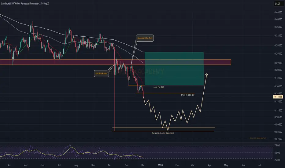 SAND broke down fully from its previous structure and is now sitting below all key levels. For now the chart still leans bearish, and as long as sellers keep control we might see one more push lower into the deeper buy zone. That’s where the better risk-to-reward setup would form.