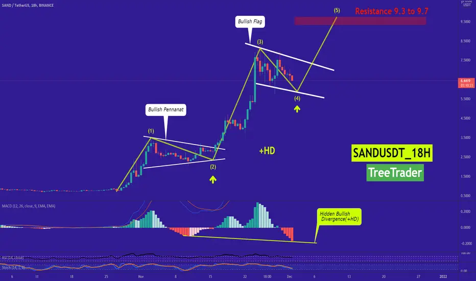 SAND has done a Massive Bullish Movement Recently But It seems There is Room For Bulls For another Bullish Wave! as you can See The Price has been Increasing Beautifully according To Elliot Waves Principle! The First 3rd Impulse waves Has Been Completed,The Price is In The 4th Impulse wave Right now which is a Correction wave! after The 4th wave is completed which is Expected to happen in a Few days, The 5th wave Will be Started & the Bullish Wave can Increase Up to 9.3 or 9.7$. Not Only The Elliot Waves Suggest This, But There is also a Bullish Flag on The chart which Suggest The Same Price Prediction! The Price was In a Bullish Pennant Not Long Ago & It worked Perfectly So There is a High chance That The Same Thing Happen Here with This Flag! There is also a Hidden Bullish Divergence (+HD) On MACD as well! all Evidences Suggest a Bullish Movement For Sand ! The 5th Wave and The Bullish Break out can Happen Soon and We shall See SAND reach 9.7$!