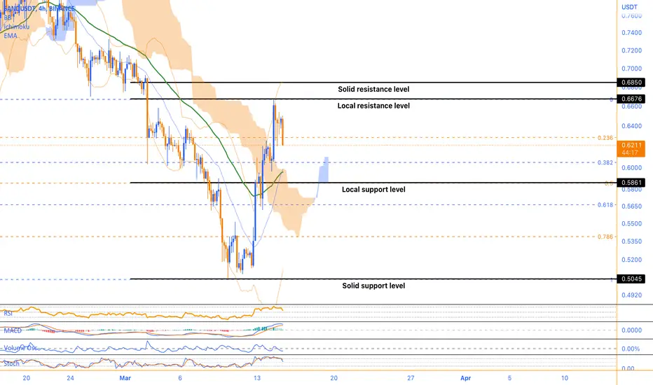 The upper Bollinger band for the 4-hour timeframe is at 0.6850, while the lower Bollinger band is at 0.5122, and the middle Bollinger band is at 0.5986. This indicates that there is a moderate level of volatility in the price of SAND, but it is still within a relatively tight range.