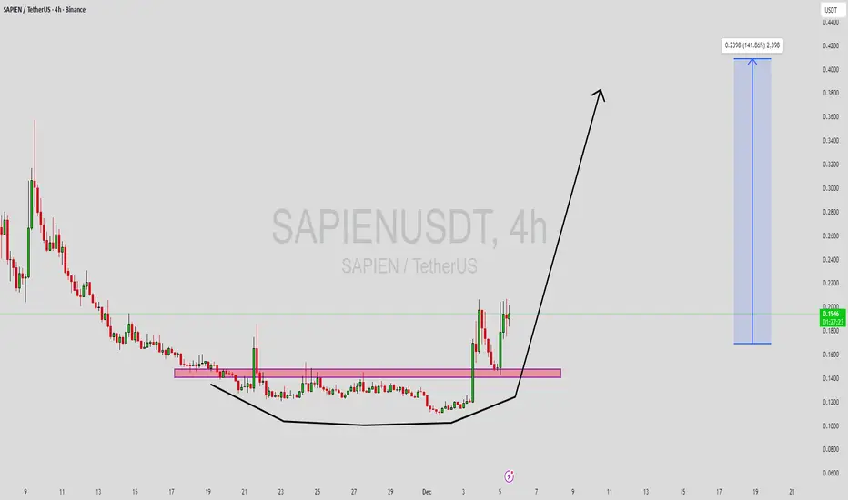 SAPIENUSDT is forming a clear bullish wave pattern, a classic bullish reversal signal that often indicates an upcoming breakout. The price has been consolidating within a narrowing range, suggesting that selling pressure is weakening while buyers are beginning to regain control. With consistent volume confirming accumulation at lower levels, the setup hints at a potential bullish breakout soon. The projected move could lead to an impressive gain of around 90% to 100% once the price breaks above the wedge resistance.