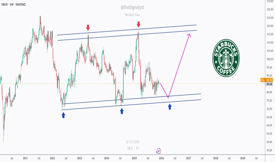 ⚔️Right now, Starbucks is retesting the lower bound of this long-term channel, a zone that has historically acted as a strong support (blue arrows).