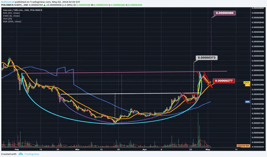 Siacoin is one of the select few alts whose cup and handle pattern has already successfully triggered without being a fakeout. It may not have reached the full projected breakout target yet but that's because on the way there it started forming another cup and handle around the smaller cup and handle. This is much like a cup and handle fakeout can do at first..however siacoin was not a fakeout as you can see by the large surge of bull volume right when it broke the original neckline. Siacoin is already showing you its plans for a sequel before it's original blockbuster has even left the theatres. Keep an eye on siacoin because it looks like it may be done forming its bigger cups handle...there is increased likihood that this bigger cup might not trigger since it already had one succesful cup but worth paying attention to none the less because double cup and handles can exist both in this fashion when it's a c&h inside a bigger c&h or when the cup of a smaller cup and handle is the handle of the bigger cup.
