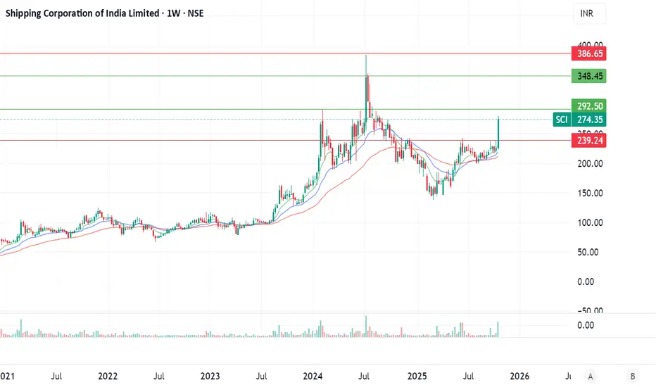 Price recently had a strong weekly move upward, clearing what appears to be a breakout above prior resistance (~ ₹240-₹250 zone).