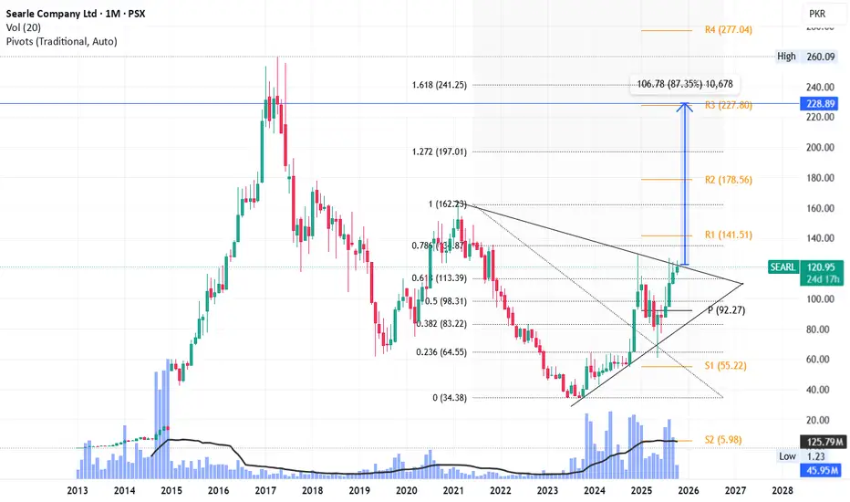 Price has been consolidating since 2021 between roughly PKR 60–120 inside a converging triangle.