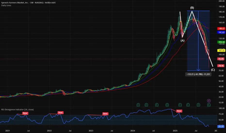 SFM is in an accumulation pattern. Eliot correction pattern is nearing completion. Stock to bottom @ 70 $. Double bottom in RSI is bullish.