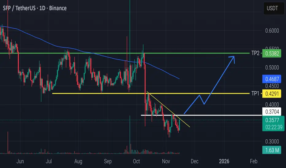 SFP is attempting a breakout from a descending trendline after forming a strong support base around 0.35.