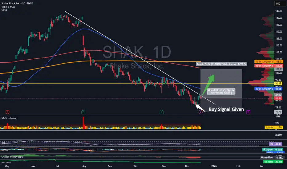 I've received two more clear buy signals from my indicator recently. Here on SHAK we were given our signal about a week ago. I didn't wait for to break that descending trendline on this one, so it may be a tad bit more risky than had I waited for that breakout. However, I have full confidence in my indicator as it has a knack of predicting breakouts before they occur. I don't doubt this will be the same.