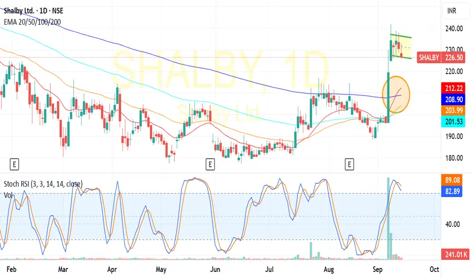 Shalby ltd:Trading at 226.50 now seems to be a value pick a this level.after a reasonable correction now trading above its 20/50/100/200 DEMA Averges in daily chart ia a clear indication of trend reversal.Shalby also formed a FLAG PATTERN in daily chart and its neck line resistance stands at 235-240,Trading above its neckline resistance see a move towards 270-300