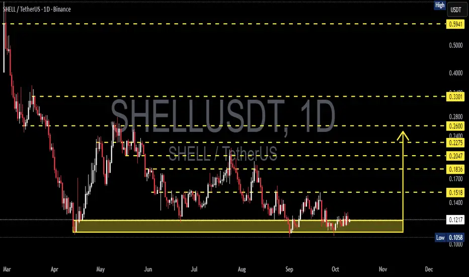 SHELL is currently sitting at a critical support zone between 0.106–0.122 USDT, a region that has acted as a strong base since May. Each time price dips into this yellow zone, buyers have stepped in to absorb the selling pressure — marking it as a battlefield between bulls and bears.