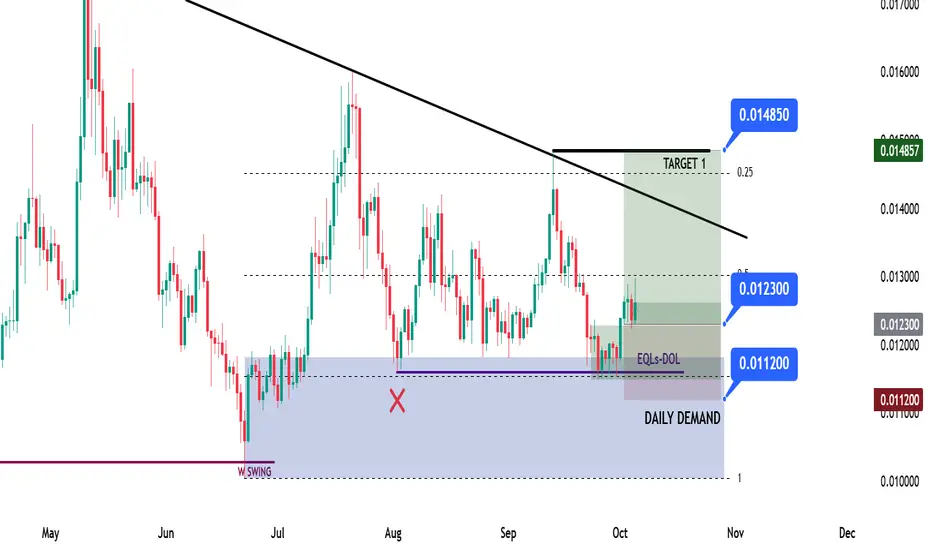 Entry already taken at $0.0123 from the retest of the daily demand + discount zone confluence.