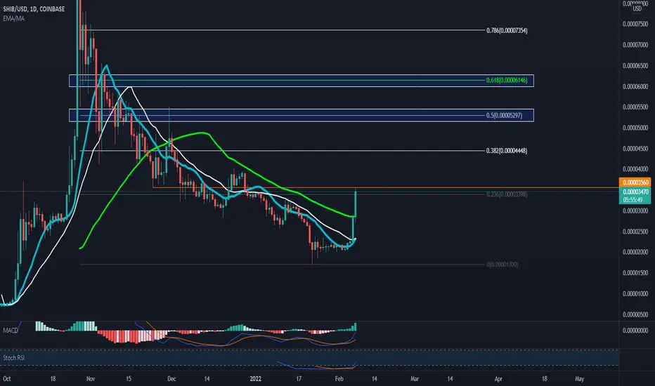 A. SHIB is now faced with resistance which was previous support back on the 21st of Nov. 2021 @ 3560. Pushing past this level could bring SHIB towards the 38.2% Fib above @ 4448.