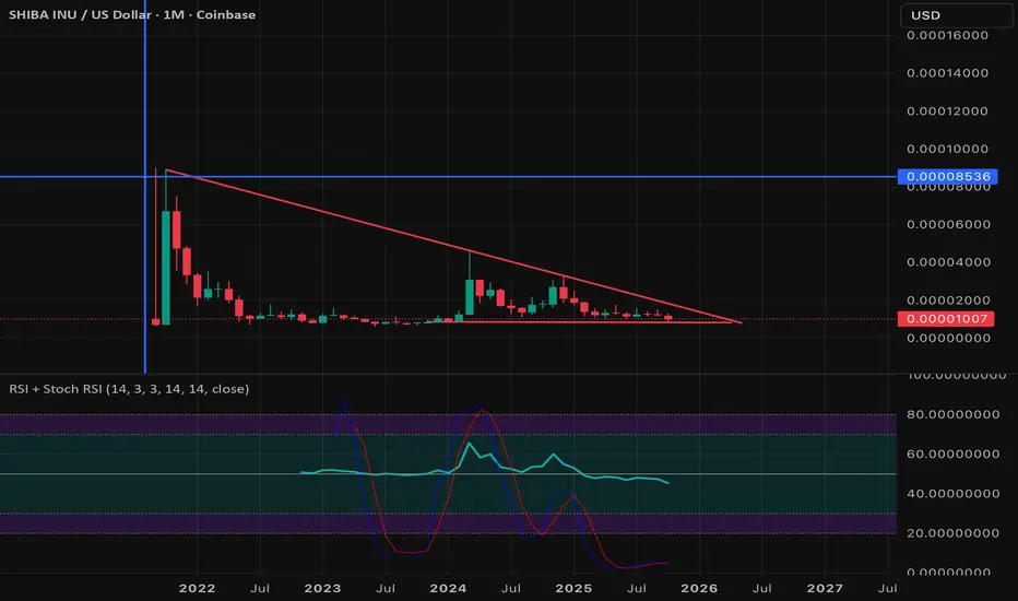 SHIBUSDT is compressing at the apex of a multi-year symmetrical triangle. Rising base support ≈ $0.0000095; upper trendline ≈ $0.000017. A monthly close > $0.000017 confirms breakout.