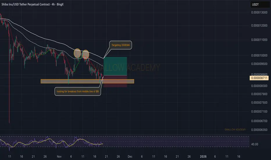SHIB is hovering inside a small accumulation area, and buyers are slowly trying to take back control. What we want to see now is a clean breakout from the middle line of the Bollinger Bands — that would give us the first sign of strength.