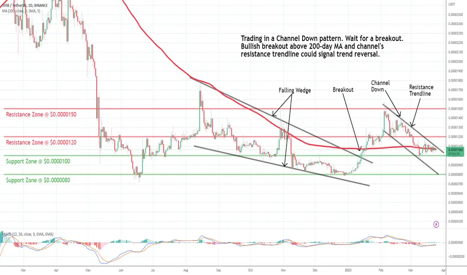 Trade setup: Trading in a Channel Down pattern. Wait for a breakout. Bullish breakout above 200-day MA and channel’s resistance trendline could signal trend reversal. Price needs to regain that 200-day MA and $0.000012 levels to resume Uptrend.