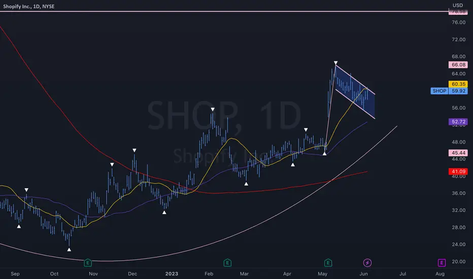 $NYSE:SHOP bull flag, needs to break out before it can continue higher to next resistance level which is the horizontal line. Very nice bottoming base.