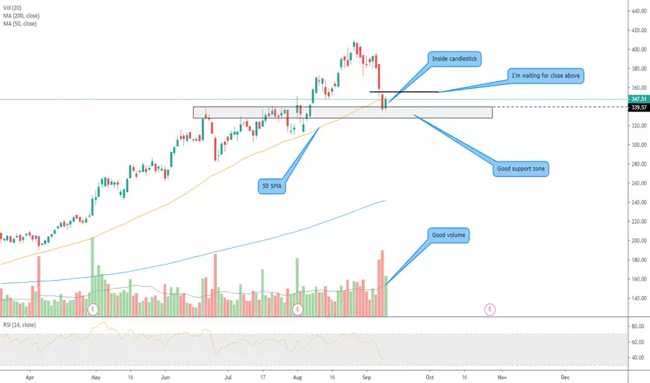 Inside patterns are tricky ... they can be continuation or reversals. However, this particular inside candlestick is right at good support (what I think is good support anyways), and it had good volume. This tells me that this particular inside pattern is leaning to to the reversal side for SHOP. I will keep my eyes open and look for a close above the big candle. If it does that, I may enter long and ride it up to its all-time high.