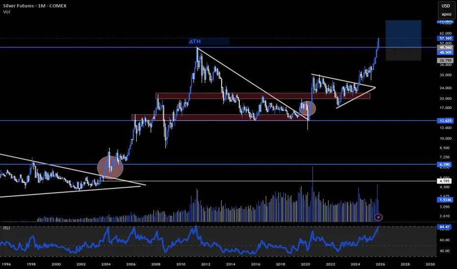 The Thesis: After decades of forming a colossal base, Silver (XAGUSD) has confirmed a structural breakout above its multi-decade all-time high resistance zone, previously capped between $49.76 and $55.00. This is not a short-term trade; it marks the beginning of a new secular bull market for the metal.