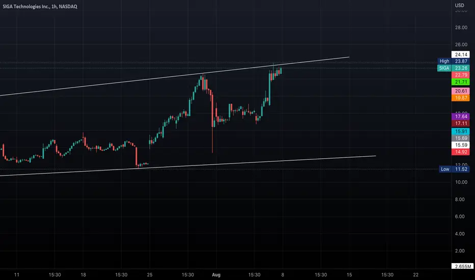 I strongly believe that a break of the flag (on the hourly) will push SIGA above the upper trendline of the ascending channel (on the daily).
