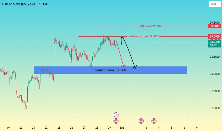 Silver price is currently approaching the resistance zone near 39.100, while the risk level remains at 39.500.