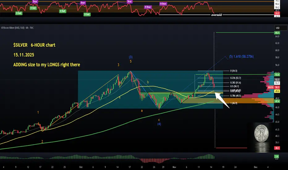 SILVER is likely in a clear WAVE 5 rally during a re-accumulation phase (hence the rectangle with a breakout point at $54.5 and targeting $65.1). WAVE 5 on the daily, 12-hour and 6-hour charts. I like this confluence in EW.