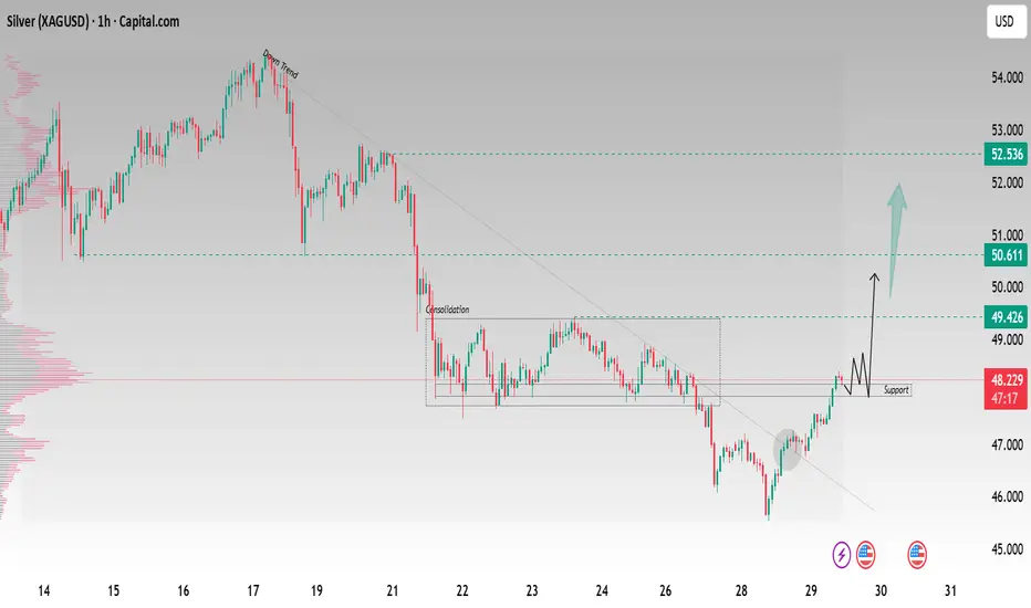 📉 After a strong downtrend, Silver has shown a bullish move from the key support zone at $48.200 🪙