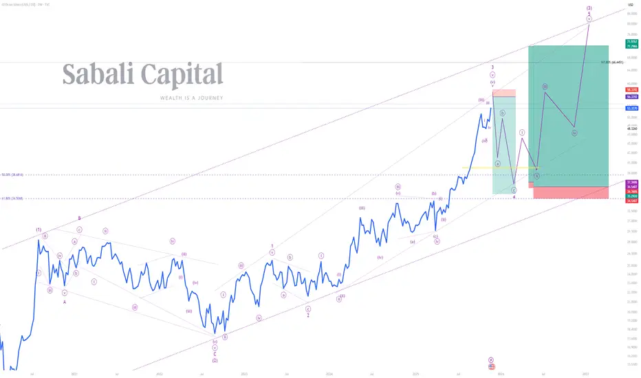Price is currently completing minor wave 3 that began printing on the 4th of October 2023. Minor wave 1 started printing on the 1st of September 2022 and terminated on the 5th of May 2023. Minor wave 2 sideways correction began when minor wave 1 terminated and terminated when minor wave 3 started printing. Minor wave 4 is expected to be a sharp correction in line with the law of Elliot Waves Guideline on Corrections (Wave 2 and 4) which states that "if wave 2 is a sharp correction, expect wave 4 to be a sideways correction, and vice versa". Thus, minor wave is forecasted to be sharp and retrace to 50% and 61.8% retracement levels of minor wave 3, i.e. minor wave is forecasted to terminated within the 38.6814 and 34.5068 levels before price begins printing minor wave 5 to complete intermediate wave (3) as indicated on the primary chart.