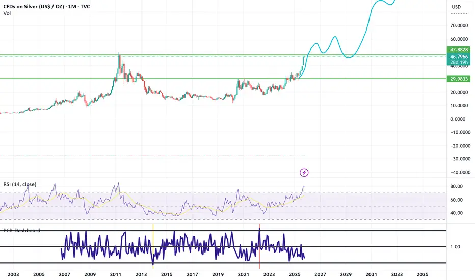 It looks like silver is nearing a critical point. Above the ATH it unlocks a new growth trajectory which probably does not stop before a mininmum 3X from the ATH. Else it falls down and attempts another cup with handle with the handle depth lower than the previous.