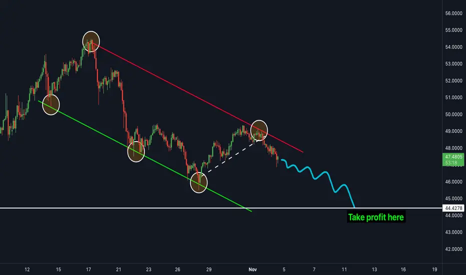 Silver has been in a clear downtrend for the last few weeks and has struggled to move to the upside. The price is currently in between a bearish channel and is bouncing in-between both resistance and support zones. The price broke the most recent trendline (shown in white) which acted as a support zone. The next target is the white line shown on the chart as "take profit". This is the next major support zone which the price is very likely to hit next.