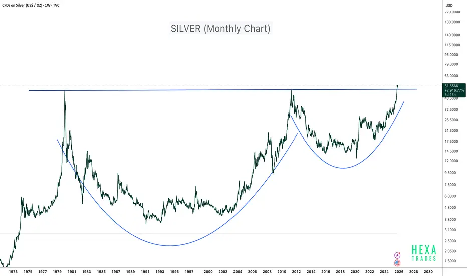 Silver has just completed one of the largest and longest cup and handle patterns in financial history, spanning more than four decades. The metal has officially broken above the 1980 and 2011 highs, signaling a potential supercycle breakout on the monthly timeframe.