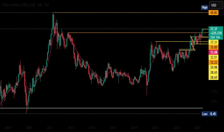 Look at the monthly chart of Silver (CFDs in USD/OZ), the longterm trend is clearly bullish. After spending over a decade consolidating below the $30–35 zone, The breakout above this historical resistance is significant and shows strong momentum, especially with price holding well above the 10-month EMA. We’re currently testing the $37.31 level, and if that gets taken out cleanly, the next major target is the all-time high at $49.83 from 2011. The recent structure even resembles a cup-and-handle or ascending triangle pattern, adding more weight to the bullish case. Support zones are now layered at $35, $33.06, and $32.51—key levels that were previous resistances. If there's any dip back to those zones, it may offer a solid buy-on-dips opportunity. As long as Silver holds above $35 on the monthly chart, I stay bullish with eyes on a move toward the $49.83 zone.