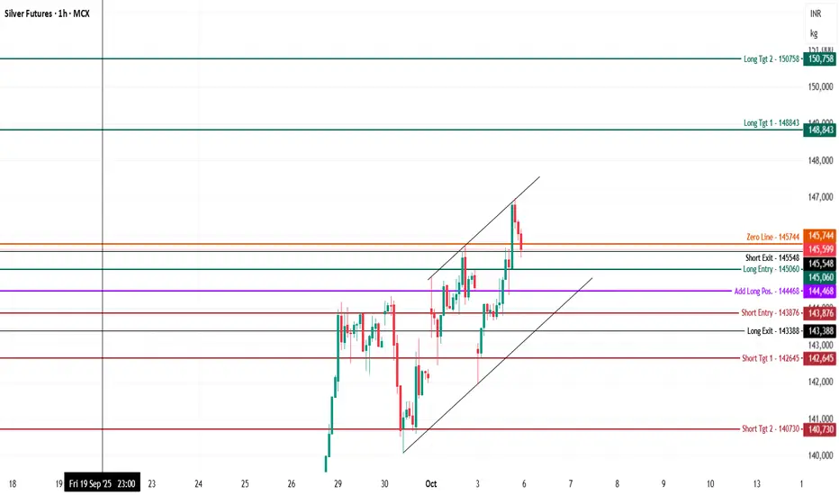 Silver is trading at 145,599, following a recent pullback from a rising wedge pattern near the upper channel boundary, currently testing the zero line level as support/resistance.